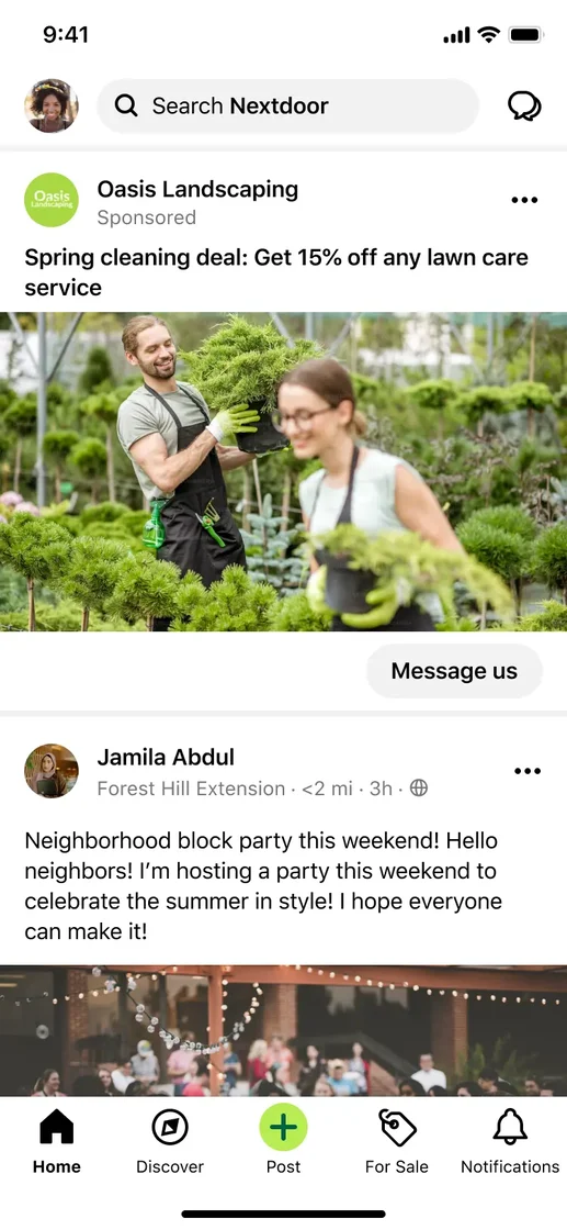 Nextdoor is an app with over 100 million verified users across the globe, which includes a network of 1 in 3 active U.S. households. It allows members of communities to connect with businesses and residents alike. According to platform demographics, 94% of members are the household “CEO,” meaning they are the decision makers for their family. 85% of users say they look to Nextdoor to find trusted reviews and recommendations, making the platform a resource for many. It features a discussion or forum style, allowing users to interact, whether it’s a response to a post or a “like”. Members can send direct messages, sell items, and find local businesses or events.